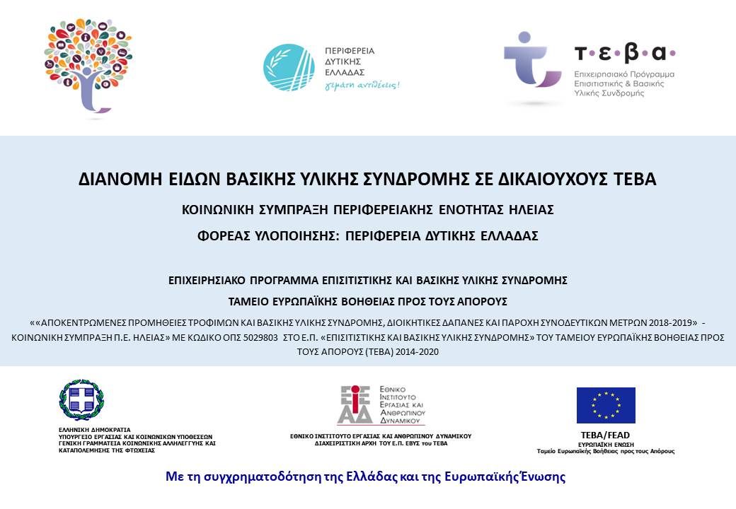 Η Κοινωνική Σύμπραξη Περιφερειακής Ενότητας Ηλείας ενημερώνει τους ωφελούμενους στο πρόγραμμα «Επισιτιστικής και Βασικής Υλικής Συνδρομής για τους απόρους (ΤΕΒΑ/FEAD)», το οποίο χρηματοδοτείται από το ταμείο Ευρωπαϊκής Βοήθειας, ότι η διαδικασία διανομής ειδών Βασικής Υλικής Συνδρομής (προϊόντα καθαρισμού και ατομικής υγιεινής, σχολικές τσάντες κλπ.), αποκλειστικά για δικαιούχους ΤΕΒΑ, πρόκειται να πραγματοποιηθεί από τους φορείς – εταίρους όπως φαίνεται αναλυτικά στο παρακάτω πρόγραμμα: