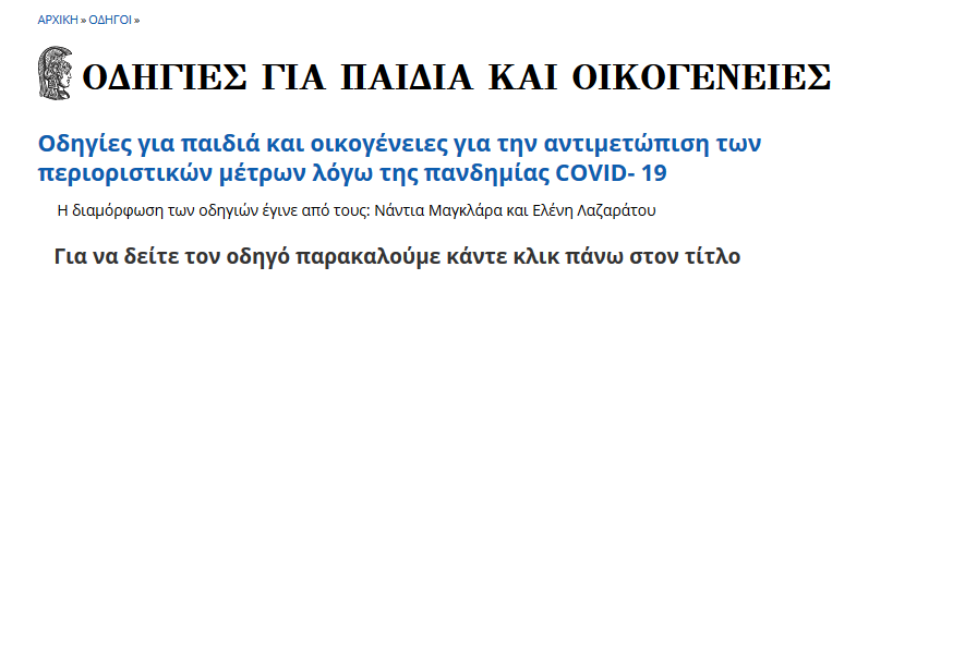 Οδηγίες για παιδιά και οικογένειες για την αντιμετώπιση των περιοριστικών μέτρων λόγω της πανδημίας COVID-19 από το Εθνικό Καποδιστριακό Πανεπιστήμιο Αθηνών!
