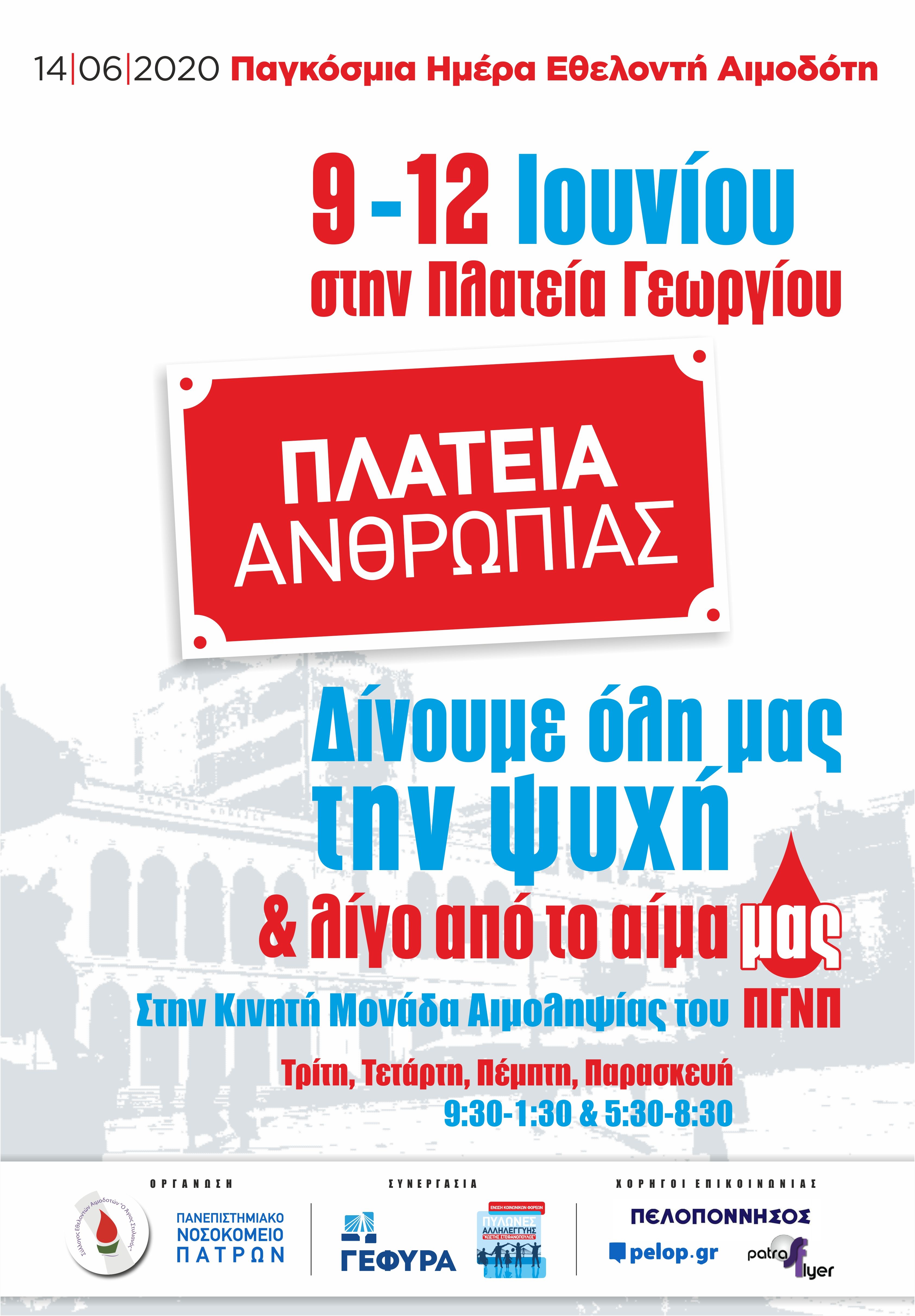 Ο Σύλλογος Εθελοντών Αιμοδοτών του Καραμανδανείου Νοσοκομείου Παίδων Πατρών «Ο Άγιος Στυλιανός» και η Ένωση Κοινωνικών Φορέων «ΠΥΛΩΝΕΣ ΑΛΛΗΛΕΓΓΥΗΣ – ΚΩΣΤΗΣ ΣΤΕΦΑΝΟΠΟΥΛΟΣ» με τη συνδρομή της ΓΕΦΥΡΑ Α.Ε. ενώνουν τις δυνάμεις τους σε μια συμμαχία για την ζωή με τίτλο «ΠΛΑΤΕΙΑ ΑΝΘΡΩΠΙΑΣ». Στην κατεύθυνση αυτή, συνδιοργανώνουν τετραήμερη Εθελοντική Αιμοδοσία, από τις 9 έως 12 Ιουνίου στην Πλατεία Γεωργίου στην Πάτρα, με αφορμή την Παγκόσμια Ημέρα του Εθελοντή Αιμοδότη (14 Ιουνίου).