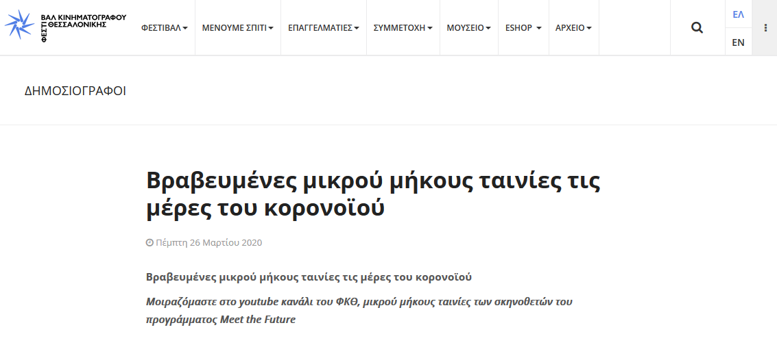 Λατρεύετε την έβδομη τέχνη και δη ταινίες μικρού μήκους; Δείτε βραβευμένες ταινίες του project «Meet the Future» του 60ού Φεστιβάλ από το Φεστιβάλ Κινηματογράφου Θεσσαλονίκης σε συνεργασία με το ίδρυμα Ωνάση.